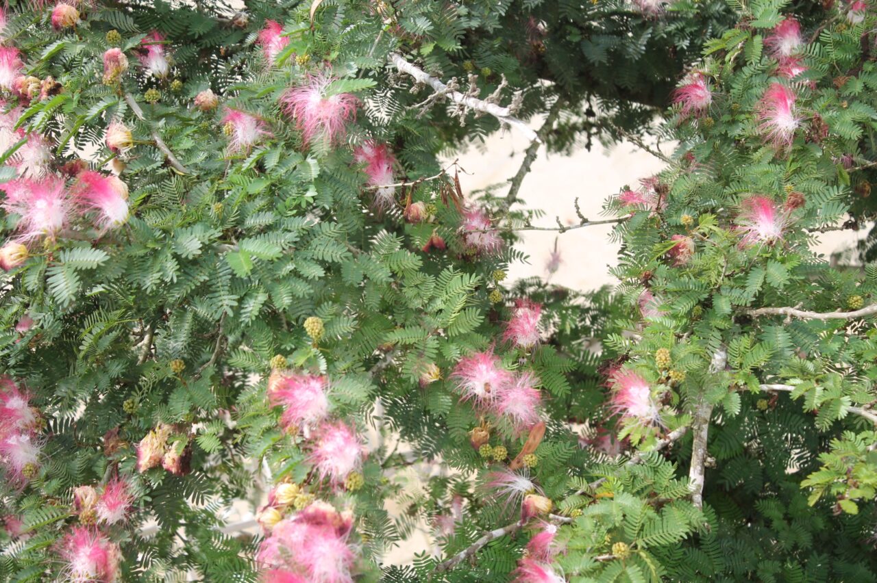 Propiedades foliares: Las hojas son compuestas y bipinnadas, divididas en numerosos folíolos pequeños y delicados que se pliegan ligeramente durante la noche o al tacto, similar a especies sensitivas del mismo género.