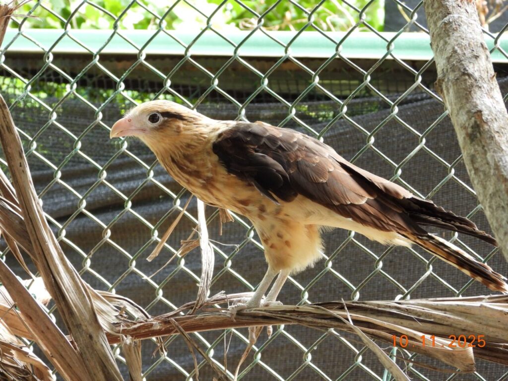 Aspectos distintivos: Tiene una apariencia robusta y distintiva. Mide entre 38 y 45 cm de longitud. Su plumaje es predominantemente marrón oscuro en el dorso y las alas, mientras que el pecho y el vientre son de color blanco crema al igual que la cabeza, con manchas oscuras dispersas. Su cabeza es pequeña en comparación con su cuerpo, con un pico fuerte, curvado en la punta y de color piel. Las patas son largas y también de color blanco crema. Se le observa frecuentemente caminando en campos abiertos, carreteras o basureros.